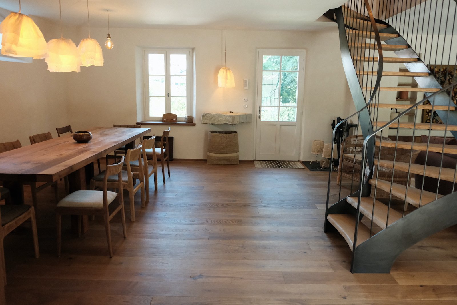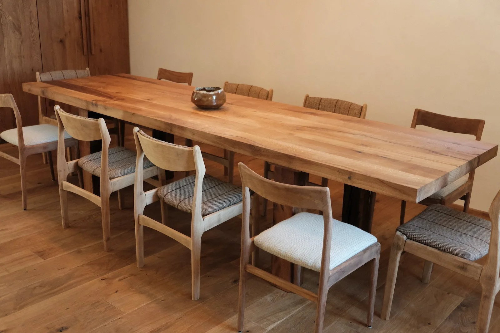 Cette table artisanale est conçue avec un plateau en chêne massif de 3,2m, elle permet de recevoir 10 couvert, montée sur un piètement en chêne de charpente 200ans, solide, au style moderne. Ce modèle est fait sur mesure pour un intérieur unique, avec une finition huile de lin. Idéal pour un espace convivial, cette table durable et intemporelle s'adapte parfaitement aux besoins d’un usage quotidien.